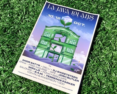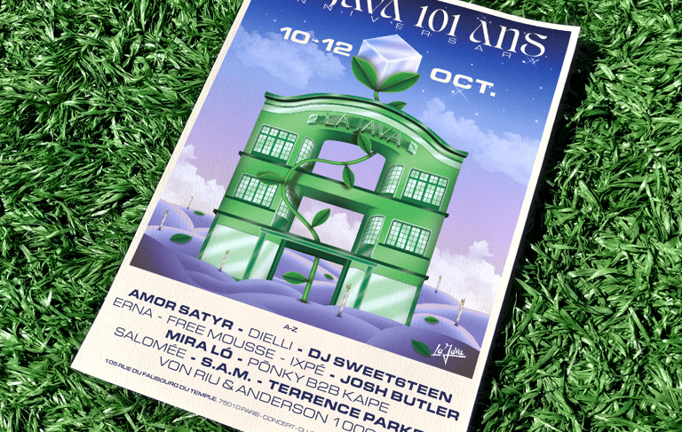 Direction artistique réalisée pour célébrer les 101 ans de La Java Belleville, un monument de la scène parisienne. Un mélange de l’histoire du club et de son architecture avec des éléments modernes et colorés.