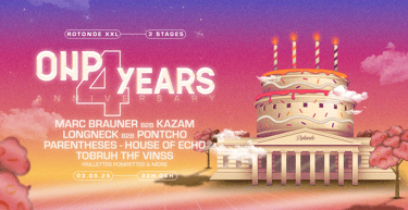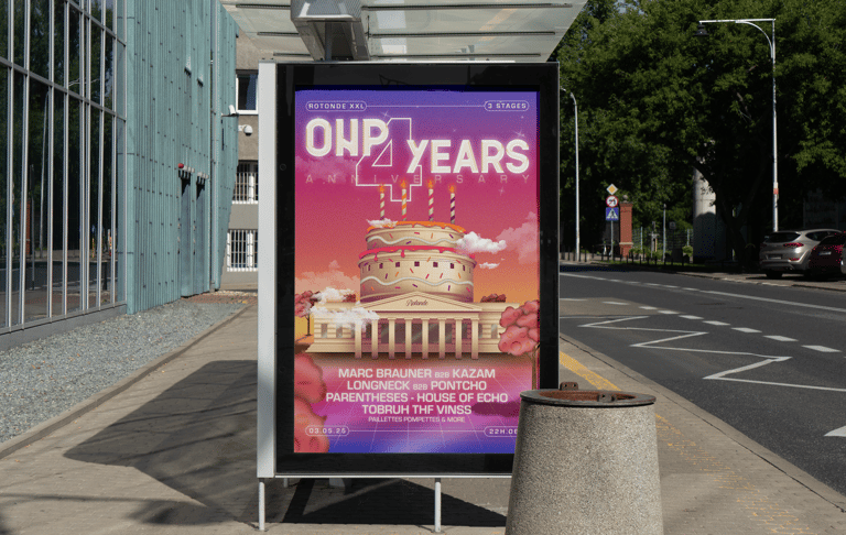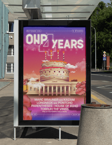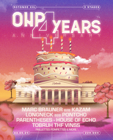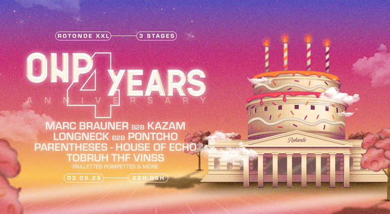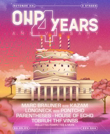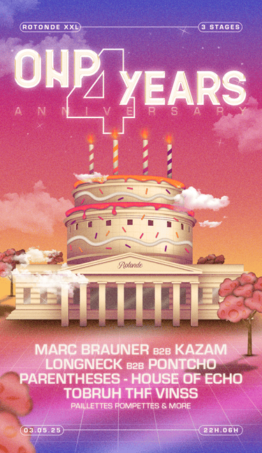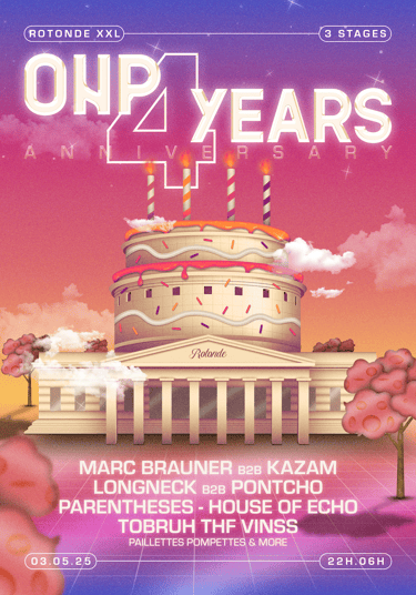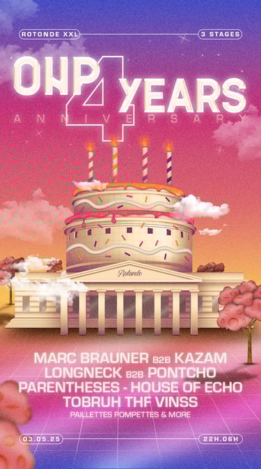 Fusion de l’architecture emblématique de la Rotonde avec un gâteau d’anniversaire, clin d’œil festif à ces 4 années de fêtes. Techno, house & vibes sucrées au programme.